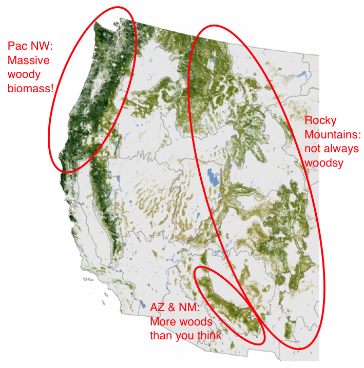 - Arizona and New Mexico have way more trees than I thought - probably high elevation areas with ponderosa pine and aspen.